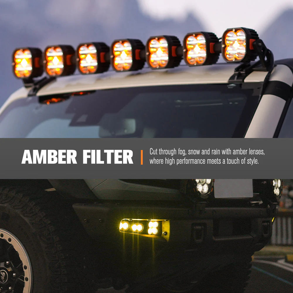 - Amber Filter: Our amber lenses cut through fog, dust, and snow for clearer, safer driving in adverse conditions, while adding a sleek touch to your ride.