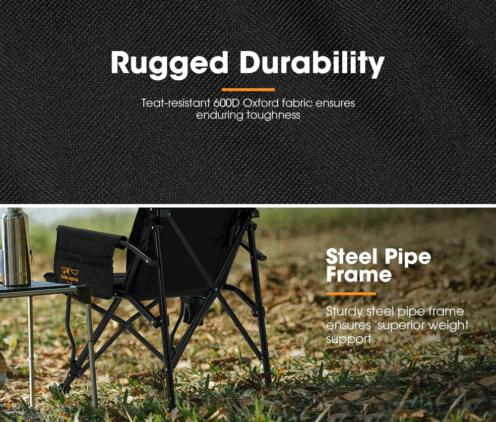 - Rugged Durability: Crafted from tear-resistant 600D Oxford fabric and sturdy steel pipe frame, our premium folding camping chair ensures enduring toughness and supports up to 200kg.